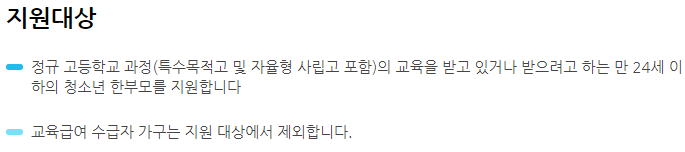 청소년 한 부모 고교생 교육비 지원 대상은 만 24세 이하의 청소년한부모를 대상으로 합니다. 말씀드렸다시피 교육 급여 수급자 가구는 지원대상에서 제외된다고 합니다.